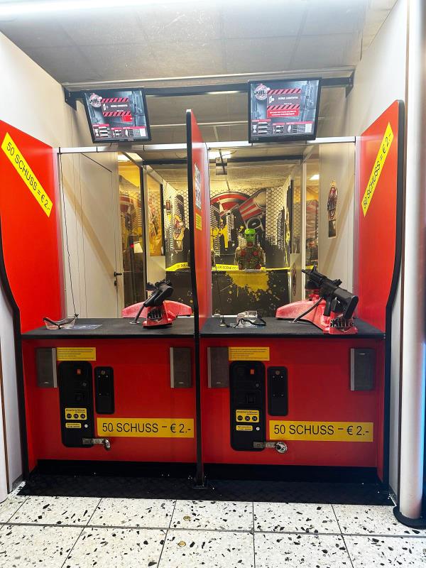 bietet ein komplettes, zweiplätziges Schießspielsystem für den gewerblichen Einsatz. Das System startet automatisch nach Münzeinwurf, wobei Preis und Schussanzahl frei einstellbar sind. Dadurch lässt sich die Anlage optimal an den jeweiligen Standort und die Zielgruppe anpassen.
