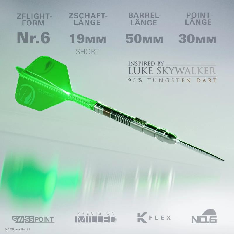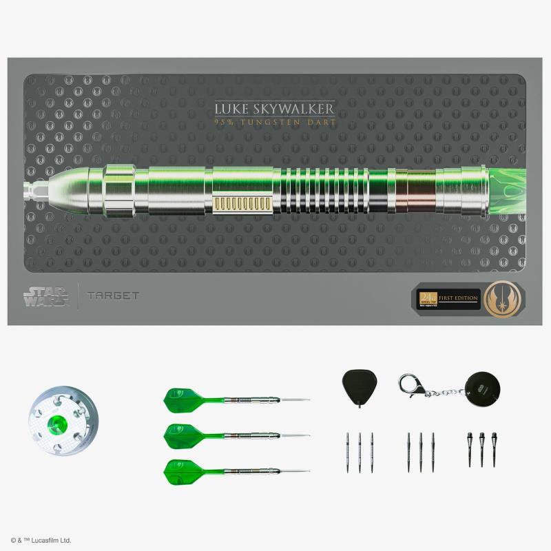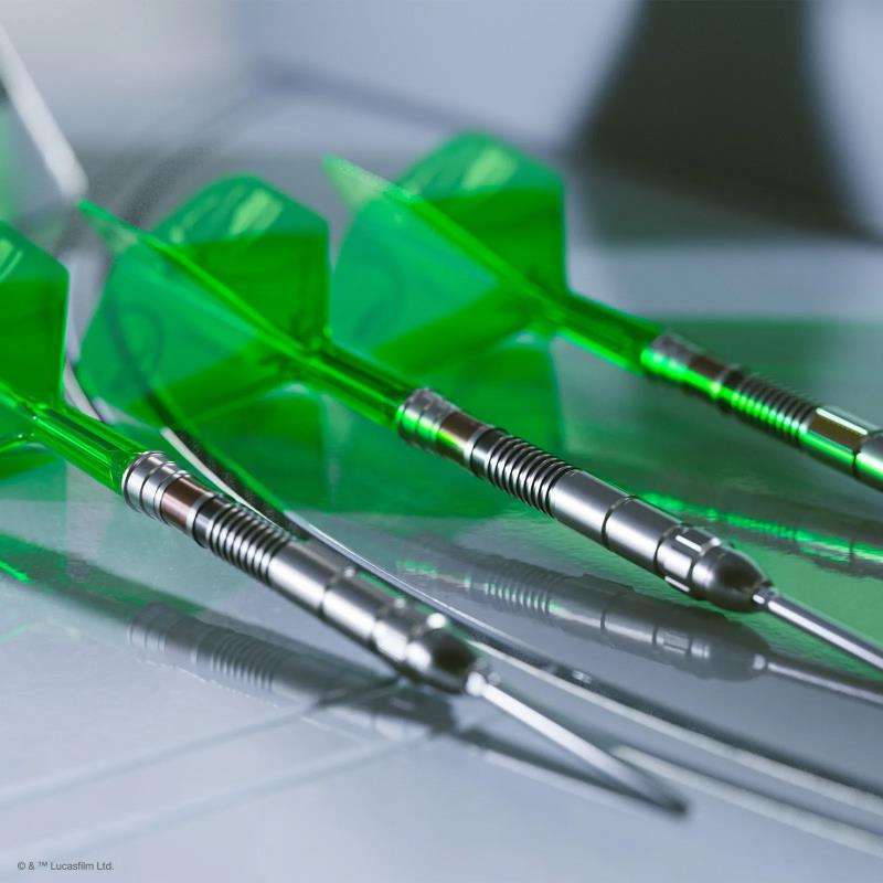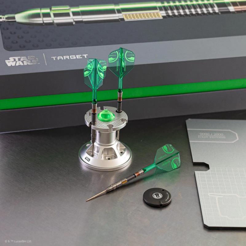 Abgerundet wird das Setup mit K-Flex mit integriertem Flight und Schaft aus transparentem grünem Material, die an das Leuchten von Lukes Lichtschwert erinnern sollen und gleichzeitig für aerodynamische Stabilität sorgen. Darüber hinaus beinhaltet jedes Set einen exklusiven Lichtschwert-Präsentationsständer – ein hochwertiges Sammlerstück, mit dem Spieler ihre hochpräzisen Dartpfeile stolz ausstellen können.