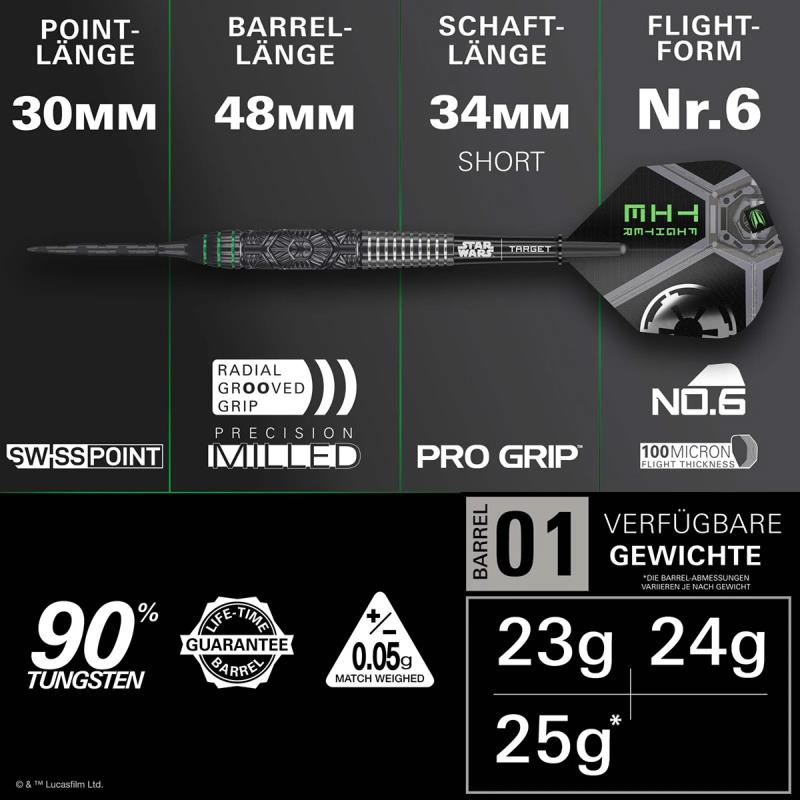 Das Design setzt sich mit den offiziellen Star Wars Pro Grip-Schäften fort, die mit ihrem leichten, stoßfesten Polymermaterial von Target die besondere imperiale Ästhetik widerspiegeln. Vervollständigt werden die Dartpfeile mit Pro Ultra-Flights in Form No. 6, die mit detaillierten Tie Fighter-Grafiken aufwarten und dem Setup aerodynamische Stabilität und eine auffällige Präsenz verleihen.