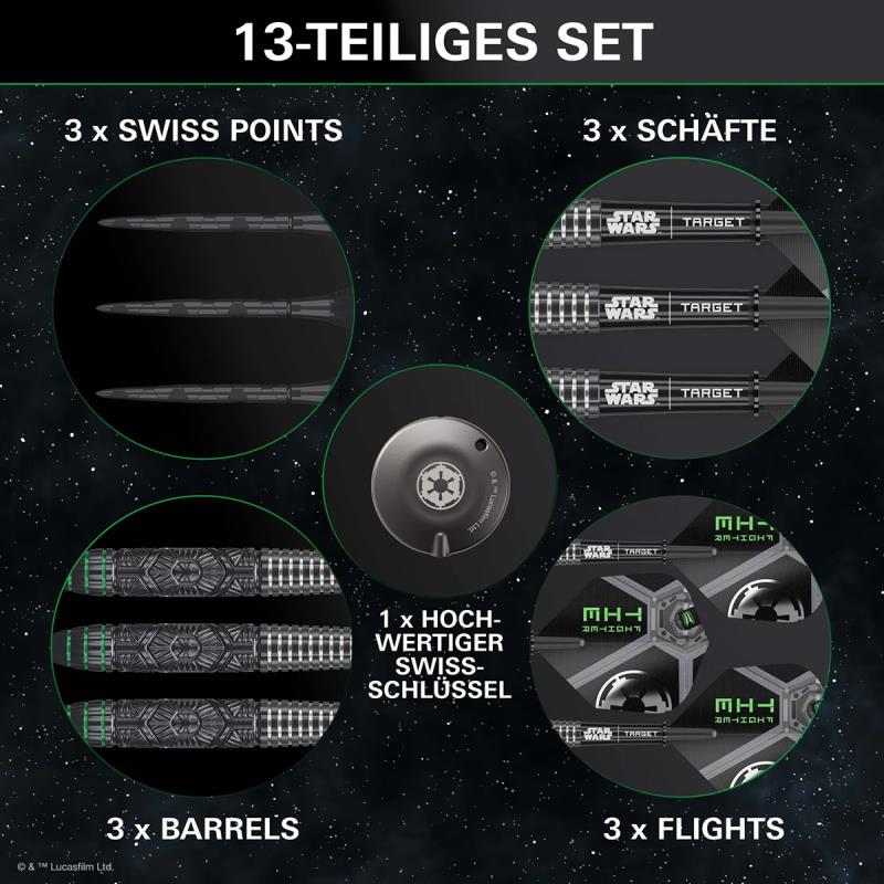 Die Tie Fighter-Dartpfeile sind mit patentierten Onyx Swiss Storm Points von Target bestückt, die für einen sicheren Halt in der Dartscheibe und schnelle Wechsel mit dem inkludierten Swiss Point-Tool sorgen. Die Points erinnern mit ihrer mattschwarzen Oberfläche an die Tarnfähigkeiten und die Eleganz der imperialen Flotte und bieten höchste Zuverlässigkeit und sauberes Eindringen in die Dartscheibe.