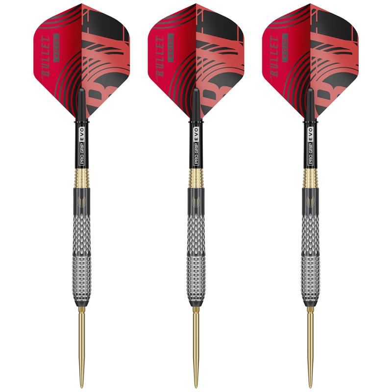 Abgerundet wird das Setup durch kurze Pro Grip EVO Schäfte, die für erhöhte Flexibilität und Stärke entwickelt wurden, um Ablenkungen zu reduzieren und eine konsistente Flugkontrolle zu gewährleisten. In Kombination mit No.2 Pro Ultra Flights im Bullet Void Design liefern sie stabile Aerodynamik und ein stimmiges Erscheinungsbild, das Buntings präzisionsorientiertes Spiel widerspiegelt.